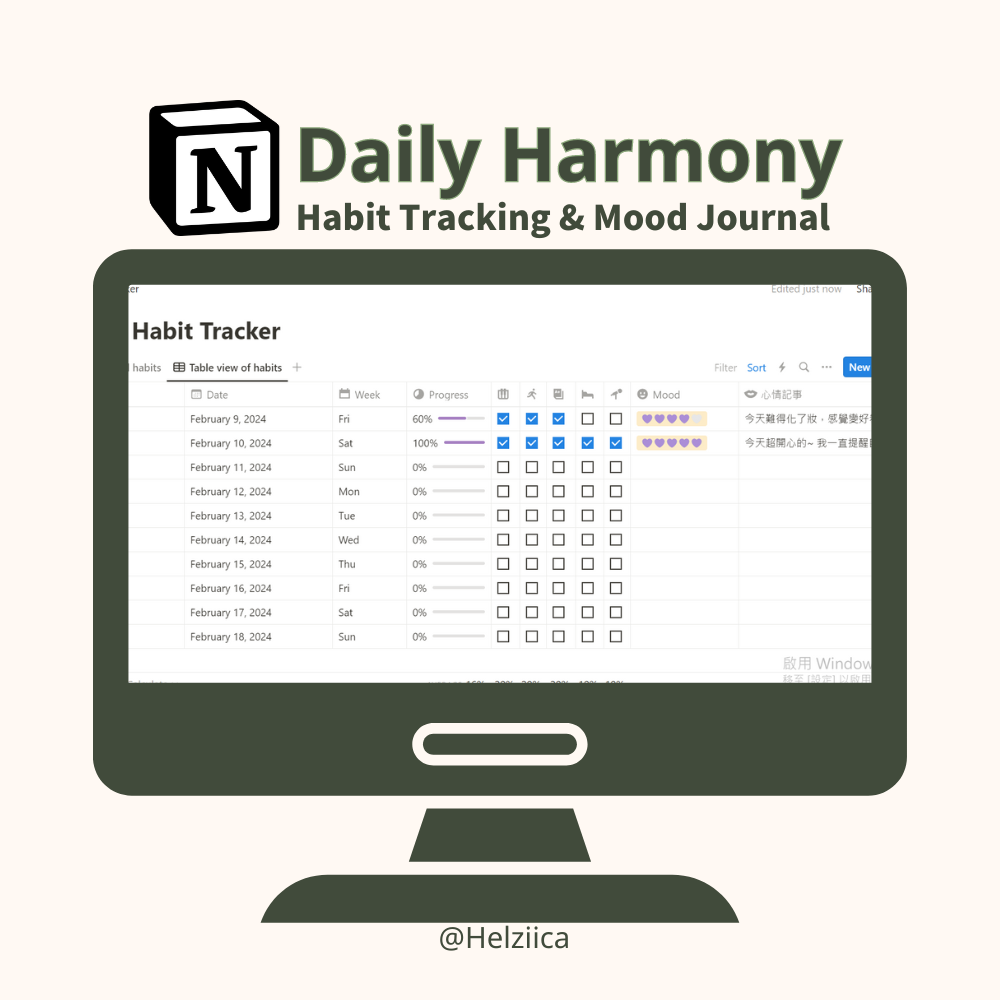 Daily Harmony:Habit Tracking & Mood Journal 是一個簡約直觀的Notion模板,專為那些想要追蹤自己日常生活習慣、記錄心情,並進行簡單而有效的習慣養成分析的人群而設計。